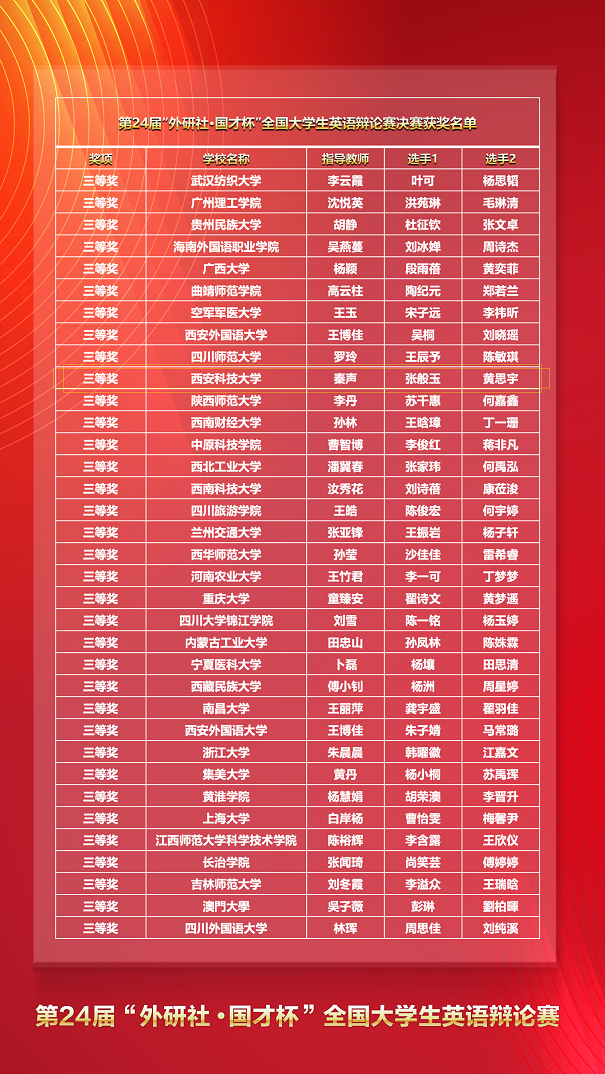 第24届“外研社•国才杯”全国大学生英语辩论赛全国总决赛于6月10日至13日在腾讯会议线上进行,来自全国东、西、南、北四大赛区的130余支队伍云端逐鹿。由Beat365中文官方网站张般玉(英语2101班)、黄思宇(法学2002班)在指导老师秦声的带领下代表Beat365官网参赛,历经三天共计八轮激烈角逐,最终获得全国总决赛三等奖。