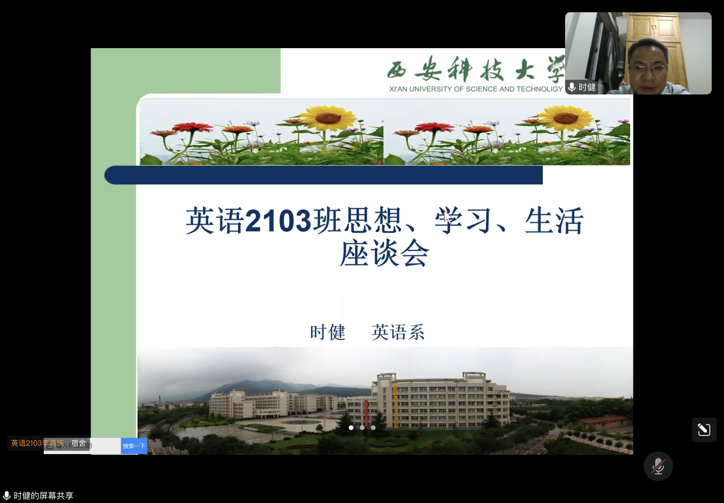 10月29日晚,Beat365中文官方网站英语2103班线上召开本学期“思想、学习、生活座谈会”。本次班会由班主任时健老师主持,英语2103班全体同学参加。