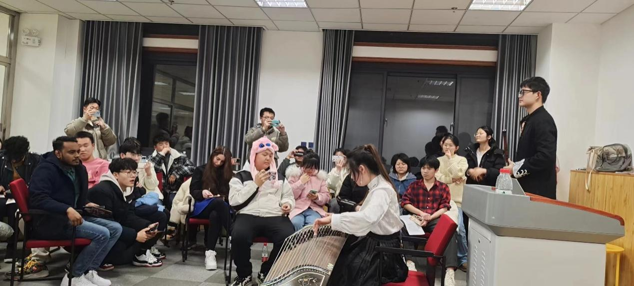 在互动环节,学生们抢答环保相关英语词汇与垃圾分类常识,在贺卡中互送祝福,现场气氛活跃。在活动最后特别安排主题音乐表演,在中国古典乐器古筝、笛子和鼓的合奏中学生们共同欣赏中国武术表演,再次感悟“绿色发展之路”这一活动主题。