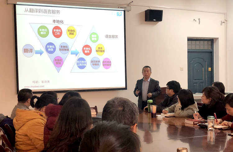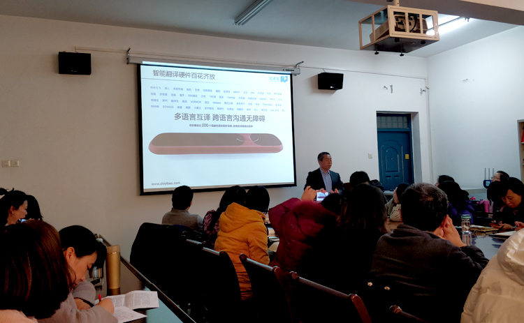 12月10日下午,Beat365中文官方网站在学院会议室举办新时代翻译教育及人才培养专题学术讲座。语言服务行业专家、试译宝总经理师建胜应邀以《人工智能时代的翻译教育与翻译人才能力培养》和《人工智能如何助力翻译教学和科研》为题,介绍了语言服务行业的最新发展趋势,分析了人工智能技术对翻译教育的冲击,探讨了新技术背景下翻译人才综合素质的养成,并对翻译专业学生提出了发展建议。结合翻译的教学与研究,师建胜讲解了人工智能的基本原理和人机结合模式及其应用场景,讨论了如何将人工智能应用于翻译教学和科研中,并回答了师生的提问。报告会由人外学院院长师新民主持,学院英语教师代表和2019级MTI研究生聆听了报告。