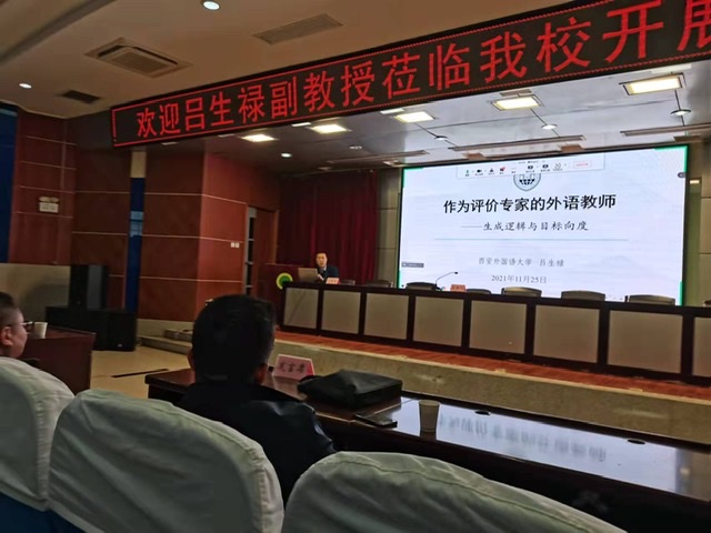 11月25日下午,西安外国语大学吕生禄副教授、硕士生导师吕生禄博士应邀来Beat365官网进行学术交流,作了题为《作为评价专家的外语教师:生成逻辑与目标向度》的学术报告。讲座线上线下同时举行,由Beat365中文官方网站院长师新民主持,学院全体外语教师、研究生及部分本科生聆听了报告。