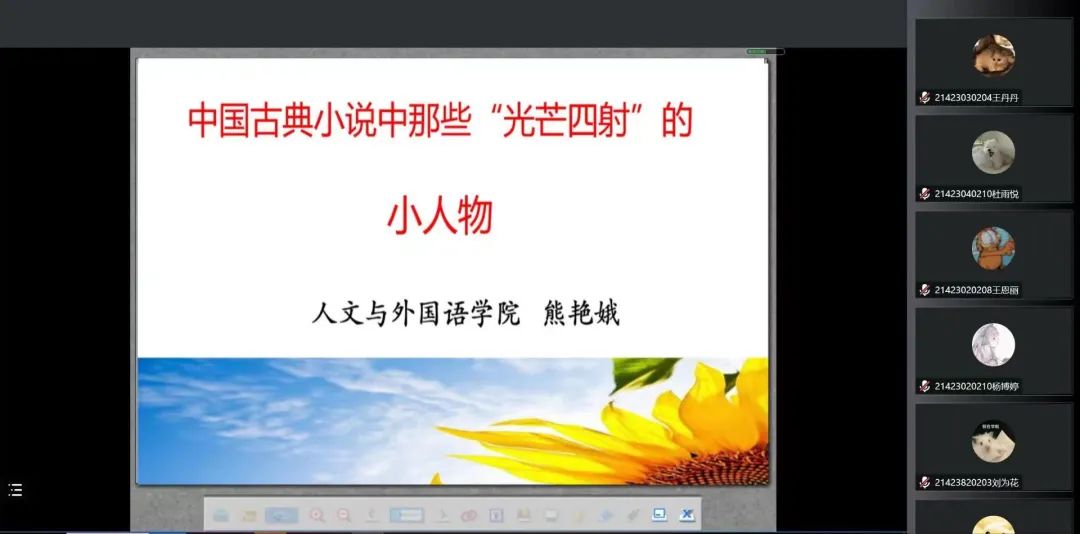 10月31日上午,人外学院熊艳娥副教授受邀进行第三讲。熊老师以中国古典小说中那些“光芒四射”的小人物为切入点,从中国传统文化的角度,简述古典小说中小人物的定义和价值,分析了古典小说中善良感恩,行侠仗义、扶危济困 ,为自由、尊严、爱情而抗争的“孤勇者”的人物形象,阐述小人物有价值的观点,引导学子感悟国学精粹,对阅读中国古典小说、理解人物角色有现实指导意义。