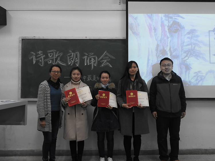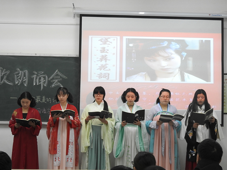主持人李思淼首先介绍了本次活动的比赛规则及评分标准。本次朗诵会共有29组同学参与,朗诵内容由参赛选手自行选定,选手可以自己制作PPT和选择播放背景音乐来烘托气氛、感染听众。随后大家按照抽签顺序,依次上台朗诵《扬州慢》、《中国少年说》、《再别康桥》和《葬花吟》等作品。其中《葬花吟》的朗诵者身着汉服,将听众带入了黛玉葬花的凄美悲凉意境中,令人印象深刻。活动前后持续一个多小时,经评委老师打分和在场听众的举手表决,最终机械学院王洪炼荣获一等奖,汉语言文学1701班李露茜、1801班谢沛娟获得二等奖,汉语言文学1701班李思淼、胥悦、韩娇获得三等奖。