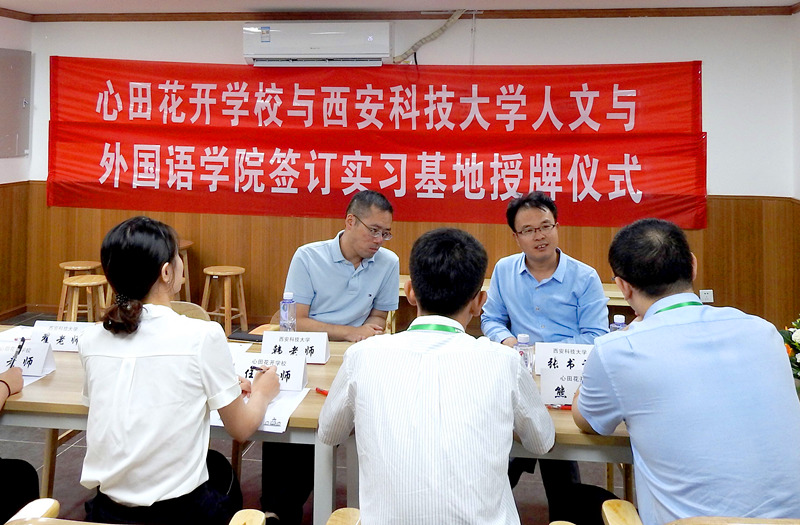 7月19日上午,Beat365中文官方网站党委副书记张振中一行3人赴心田花开学校西安分校,与心田花开学校执行总裁熊峰等进行了座谈,并代表双方签订了学生培养实践实习基地、本科生创新创业实习基地共建协议。座谈会上,双方介绍了各自的基本情况,就学生专业实践实习、创新创业、信息服务与技术支持等内容进行了深入交流并达成初步合作意向。