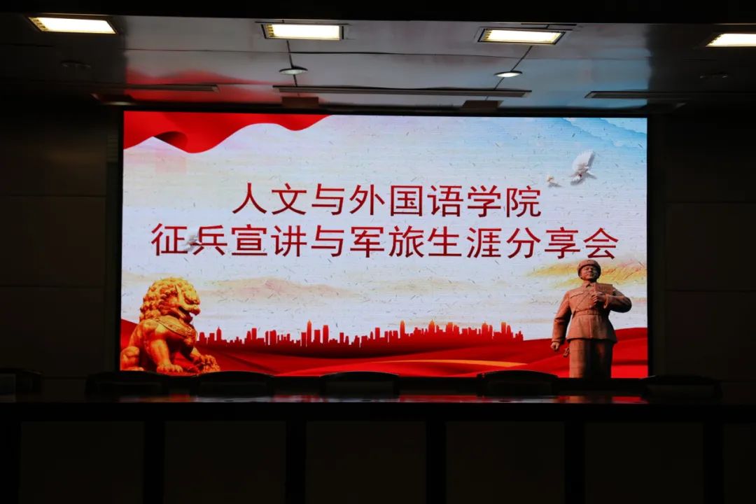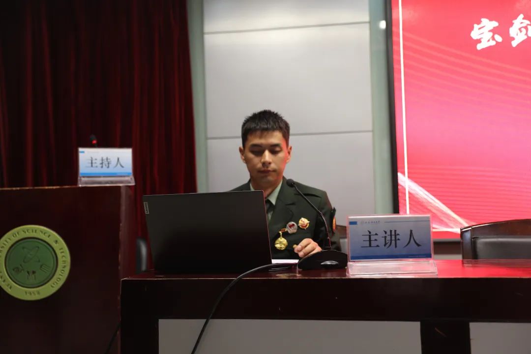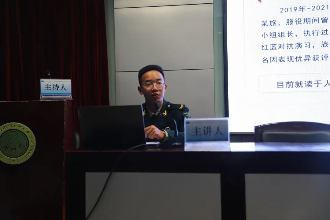 范林琼首先向大家介绍了自身服役军种火箭军,随后,通过分享自身经历阐释了参军原因,并用视频、照片等形式向学生展示了两年军旅生活的成长经历与心路历程,表达了“让青春和热血奉献给祖国”的壮志豪情。最后,范林琼向学生详细解读了国家征兵政策和学校退役政策,号召同学们积极响应国家政策,将报国之志转化为强国之行,为富国强军贡献自己的力量。
