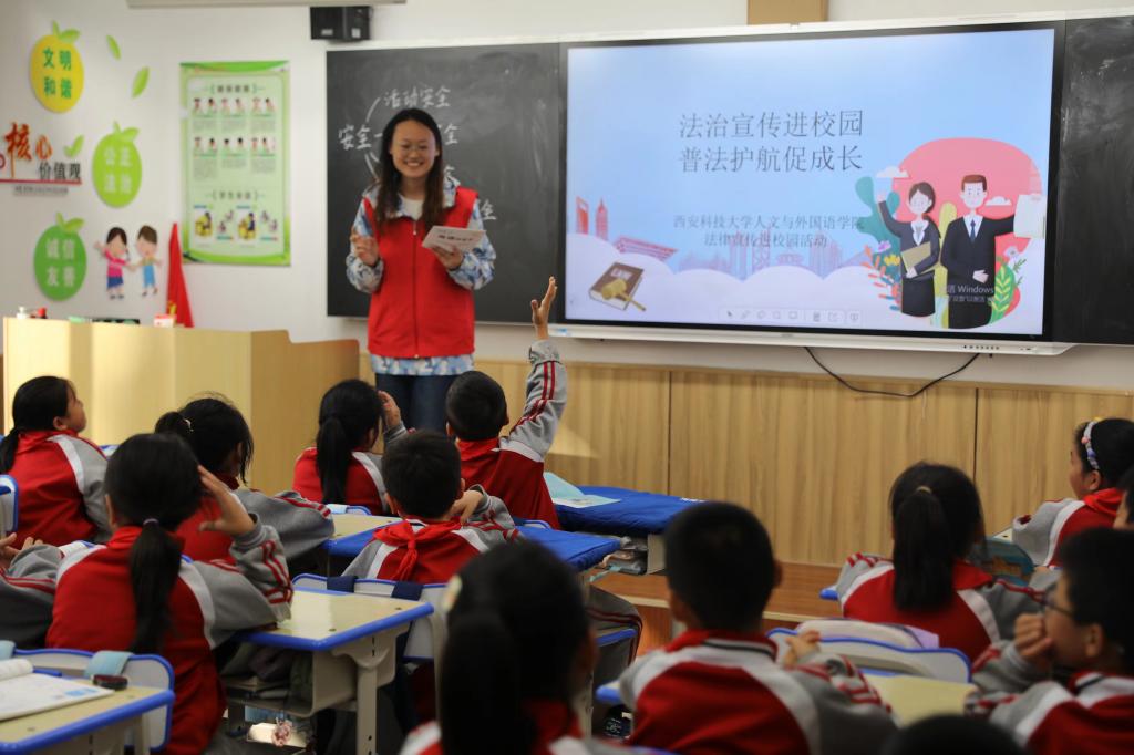 为进一步宣传贯彻习近平法治思想,推进青少年法制教育,积极响应开展学习贯彻习近平新时代中国特色社会主义思想主题教育专题学习,引导团员和青年在奉献社会、服务群众中锤炼思想、锻炼成长,10月25日,Beat365中文官方网站法学2201团支部成员与临潼区行者街道司法所共赴临潼区金骊小学开展“法制进校园”知识讲座活动。