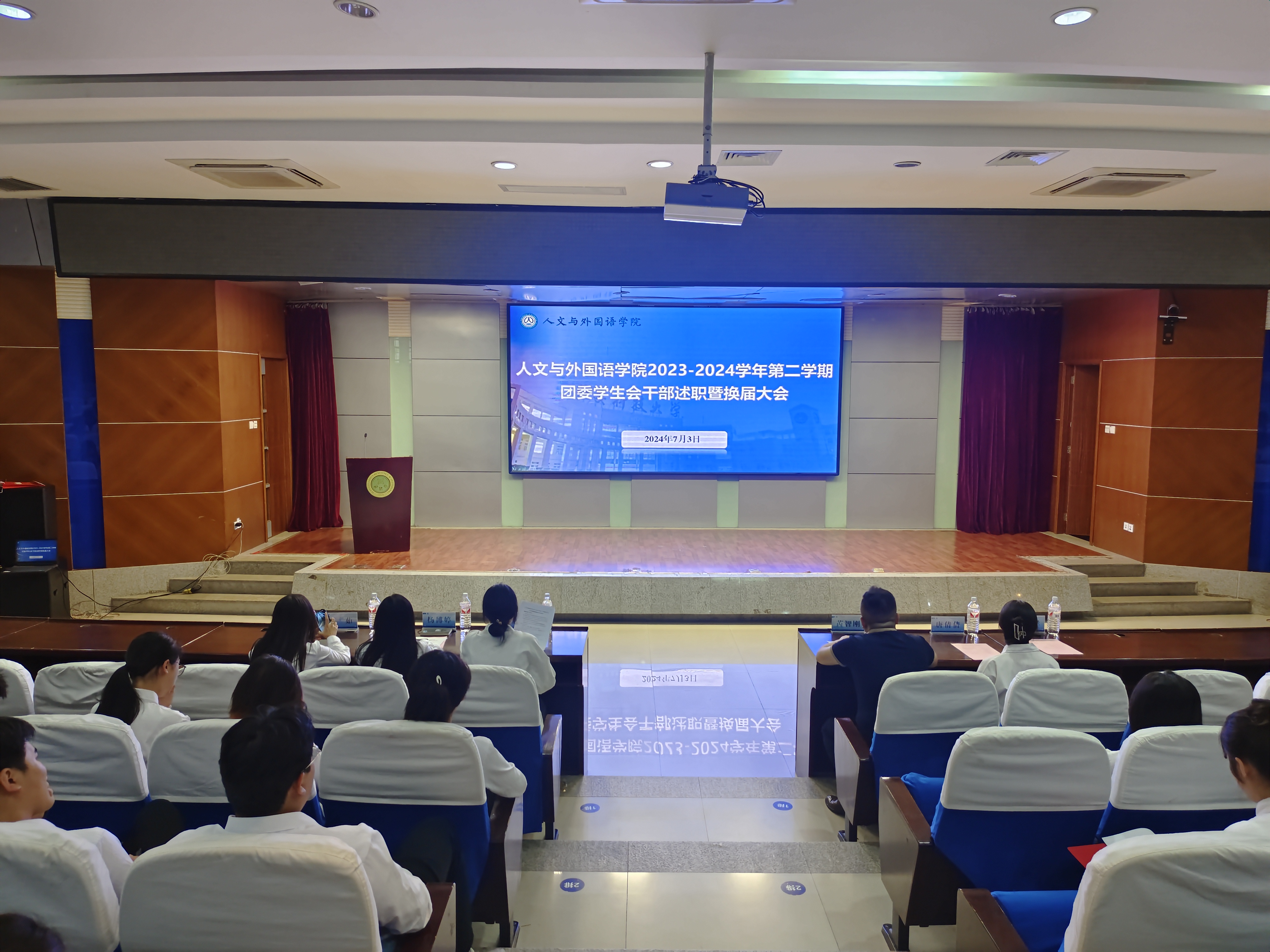 为增强学生干部的责任意识和服务意识,提升学生干部队伍整体素质,7月3日晚,Beat365中文官方网站在骊山校园图书馆二楼报告厅举办2023-2024学年团委学生会述职暨换届大会,学院团委书记芮智刚、团委学生会全体干部参加了会议,会议由学生会主席周鸿汝主持。