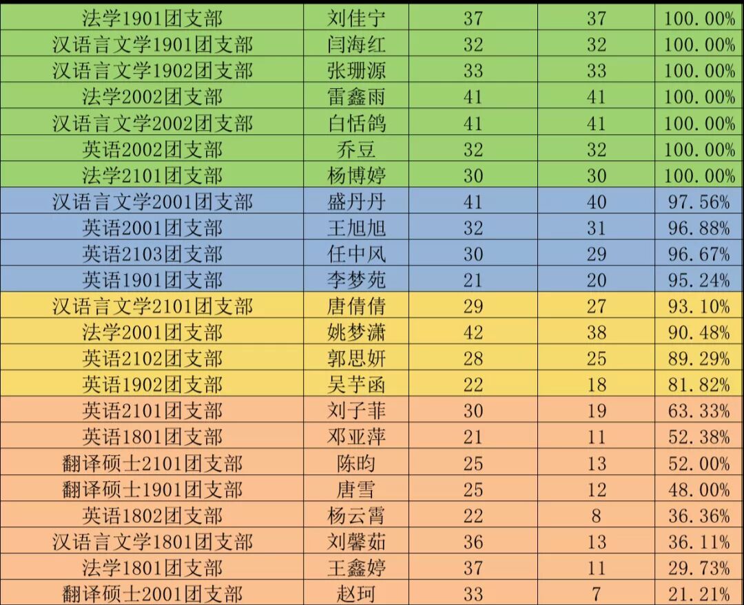 本次青年大学习,法学1901团支部、汉语言文学1901团支部、汉语言文学1902团支部、法学2002团支部、汉语言文学2002团支部、英语2002团支部、法学2101团支部学习率达到100%,4个团支部学习率达到95%以上,4个团支部学习率达到80%以上,但仍有8个团支部学习率没有达到80%,在此,希望本期完成率高的团支部能够再接再厉,而学习率欠佳的团支部,请各团支书能够起到引领作用,向所有同学强调青年大学习的重要程度,呼吁并监督大家积极学习视频内容并完成课后习题。积极提高自己的思想觉悟,争做有为新青年。