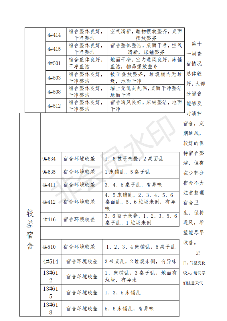 关于第十一周学生宿舍检查结果的通报
