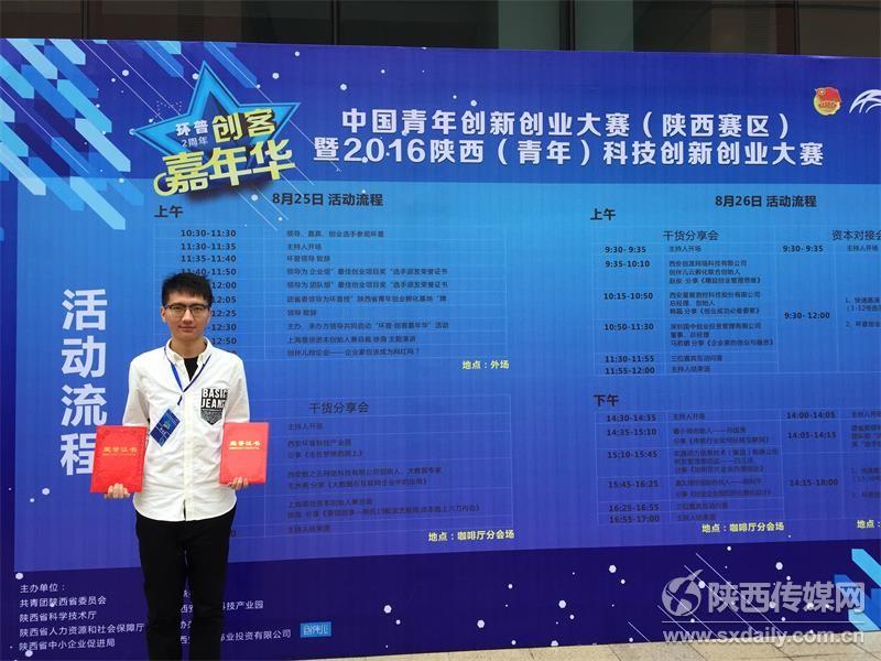 赵中扬获得中国青年创新创业大赛(陕西赛区)暨2016陕西(青年)科技创新创业大赛“最佳创业项目奖”。图片来源:陕西传媒网