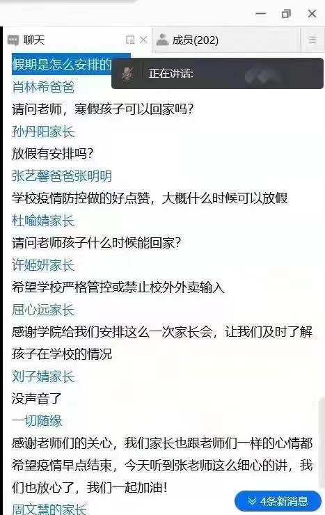 “感谢老师们的关心,我们家长也跟老师们一样,都希望疫情能够早点结束,今天听到老师这么讲,我们也放心了,我们一起加油!”家长们纷纷表示,支持与理解学校严格的防控措施,感谢学校在防疫工作所做的各项努力与付出,感谢老师对学生的关爱与帮助,对孩子的生活状况感到放心。部分家长还在会上表达了捐赠防疫物资支持学校疫情防控工作的意愿。