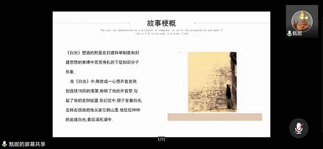 第一组以鲁迅先生的作品为前提,小组代表赵力、于轩、游宝珠、李星竹分别从令他(她)们影响深刻的小说入手详细解说了小说中的典型人物形象与所隐射的社会现实。第二组主要解读作品《白光》,小组代表肖攀分别从主题思想、艺术特色、深层意义三个方面对主人公陈士成的形象进行解读,重点分析鲁迅先生在文中对贪婪者的讽刺意味。第三组以浅析鲁迅作品中的民俗文化为主题,小组成员亚森、谢文馨、张盛雅、屈莹莹、黄楠芳以分—总形式进行深刻分析,其中选取了三篇最具代表性的文章来解读民俗文化的体现之处。第四组以分析鲁迅作品中的女性形象为主题,小组代表周鸿汝以《祝福》中的祥林嫂与《伤逝》中的子君为例,深度剖析了在旧社会大背景下女性意识的觉醒。第五组以《呐喊》、《彷徨》为例分析鲁迅小说中的知识分子的形象,小组代表崔文杰、张馨文从文本出发,结合时代背景,分析吕伟甫、魏连殳等具体人物画像,并阐述塑造人物的深刻意义。