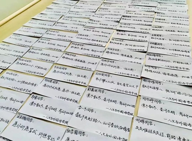 浓浓的奶茶寓意“牛气冲冲,福气满满”,不仅为在严冬里备考的学子们送去了温暖,也送上了学院的浓浓温情。湿巾寓意“远离病毒,安全上岸”寄寓着学院对考研学子们最朴素的祝愿。 每一张祝福卡,分别由学院领导、辅导员、师弟师妹为考研学生量身定制、亲笔书写的衷心祝福。一句句温暖而坚定的鼓励,一份份精心准备的文具,令紧张备考的学子感受到来自学院的关心与温暖。同学们纷纷表示,会抓紧最后的宝贵时间复习,以优异的成绩回报学院和老师们的期待。