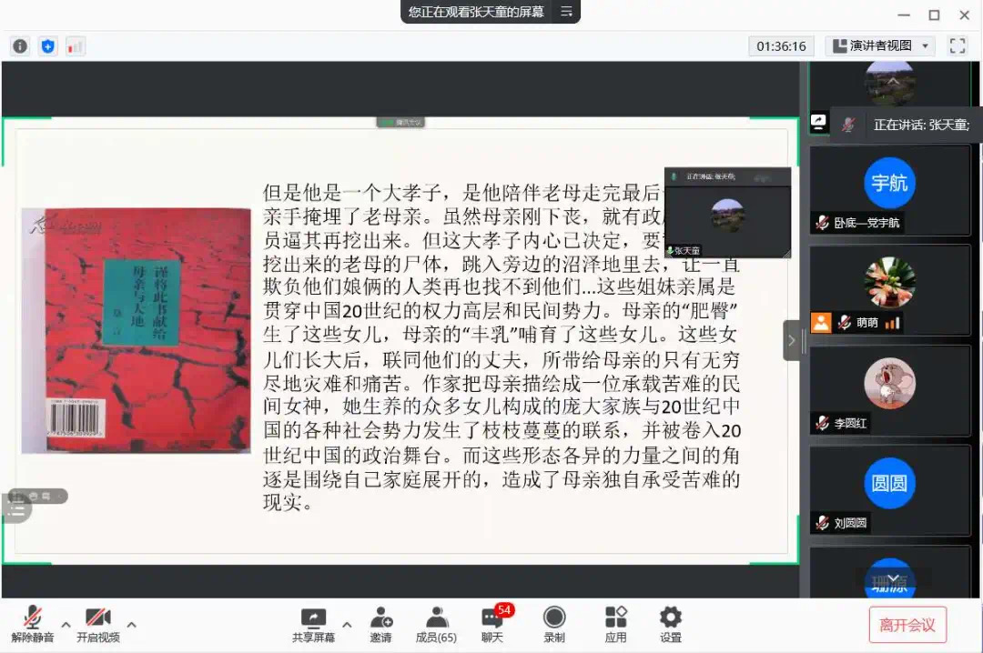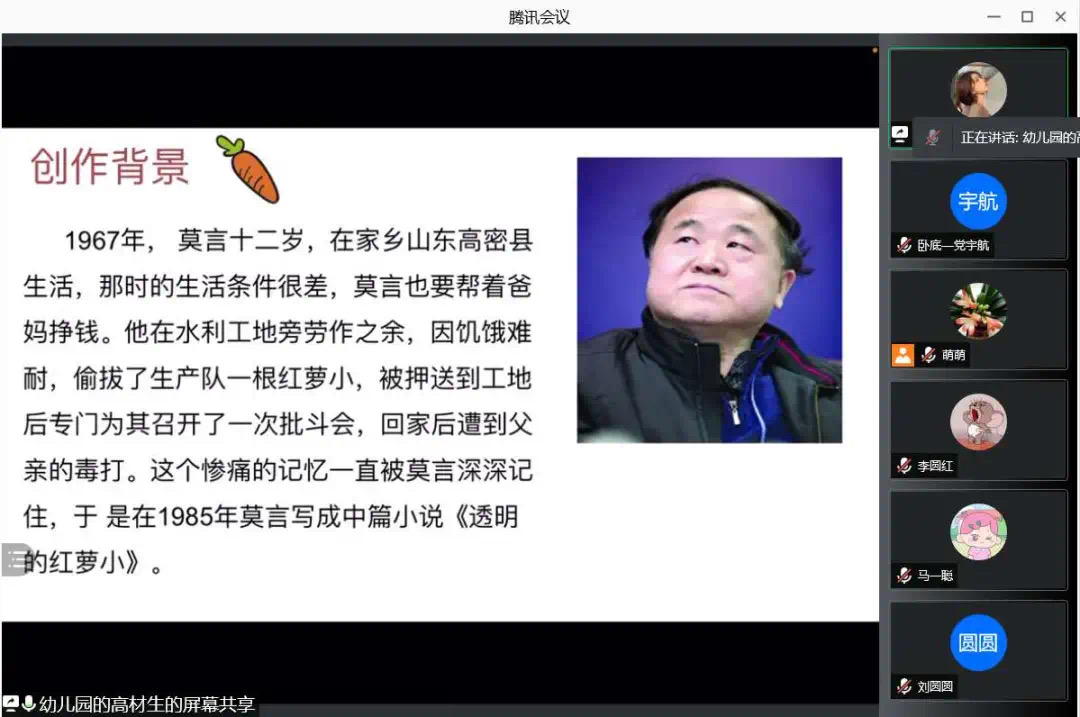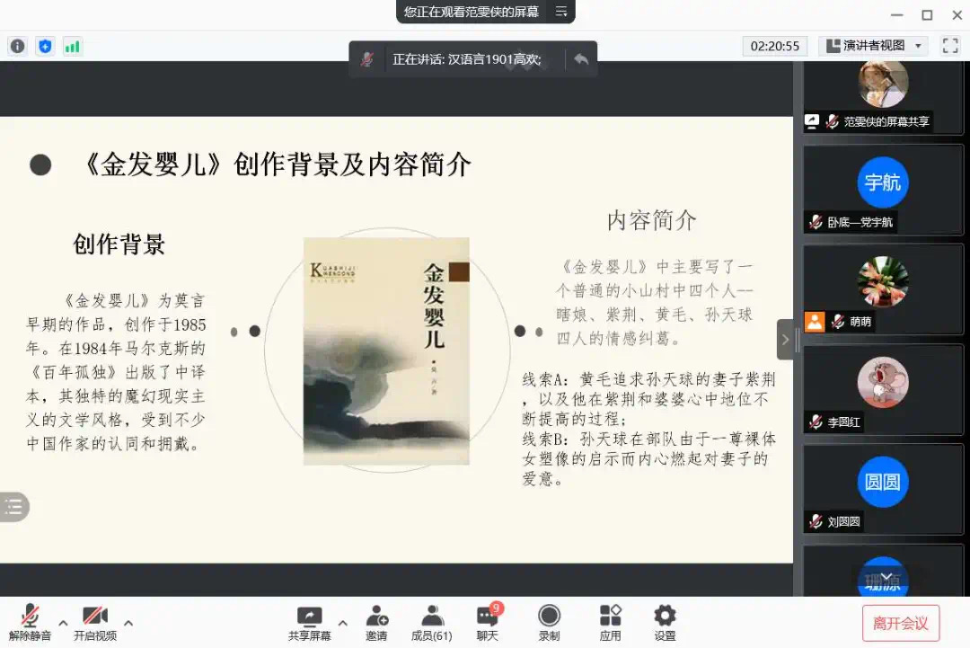 为了使大家多读书,好读书,读好书,并且“熟读而精思”,2021年10月11日,Beat365中文官方网站汉语言文学专业举办了以“莫言的小说”为主题的线上读书交流会。指导老师郭萌及汉语言文学专业19级全体同学参加活动。