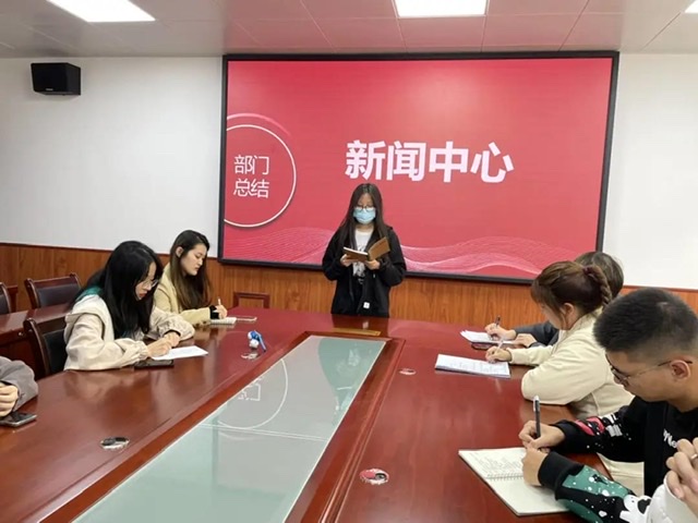 新闻中心赵海星:新闻中心负责了新生入学指南,迎新大会、中秋节、国庆节相关活动环节以及每周四的青年大学习通报,卫生考勤通报工作、露天电影影讯和外研社相关赛事活动等内容的推送。今后,新闻中心将进一步加强与各部门的协作,提升我们的工作能力,为学院增添人文色彩。