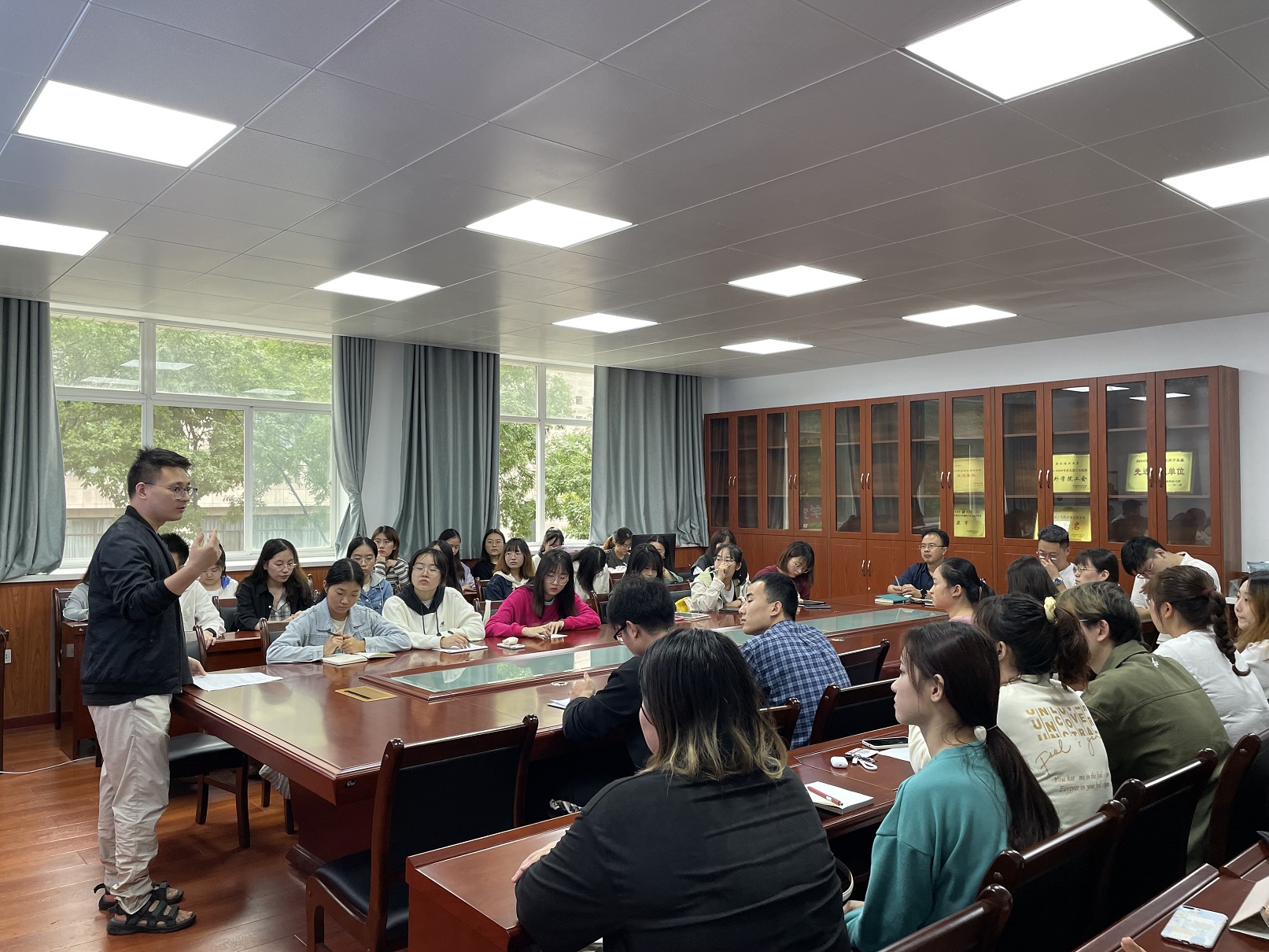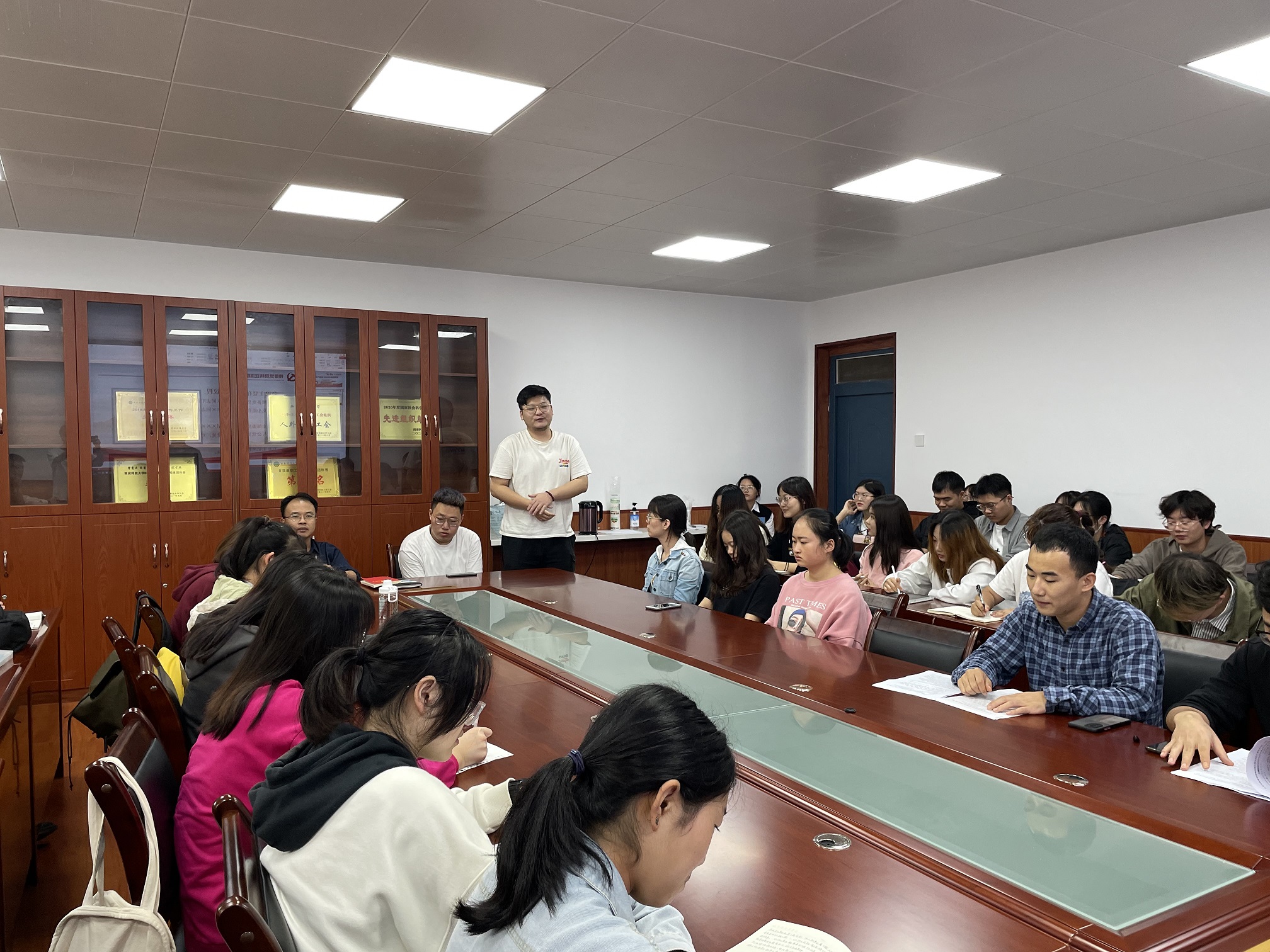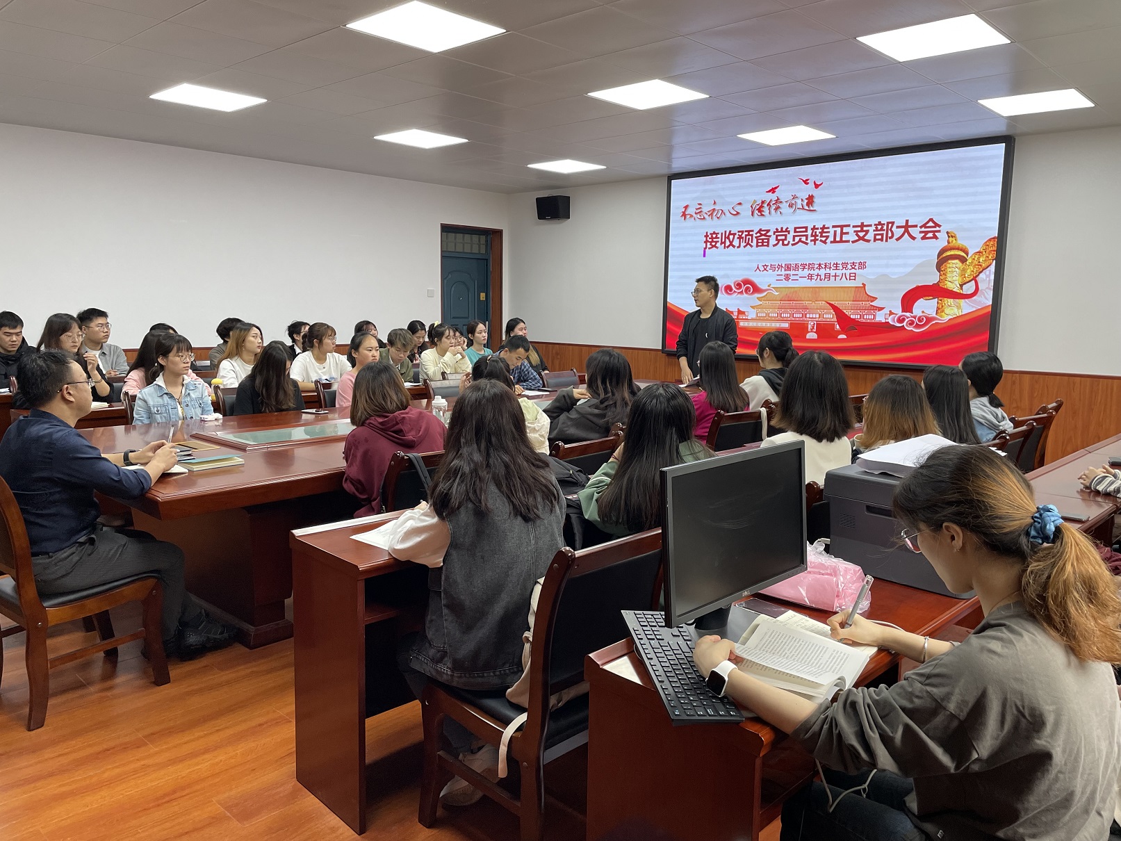 9月18日上午,Beat365中文官方网站本科生党支部于二教226会议室召开接收预备党员转正支部大会。院党委副书记张振中及党支部全体成员参加了此次会议,本次会议由学院本科生党支部书记李银亮主持。会上,李亮亮、石海廷、韦雪、黄运鹏四位同志就自身的学习、生活和工作等方面的情况做了陈述。随后,樊杰杰同志传达了党组织意见,同意四位同志成为正式党员。接着其他各位同志依次发言,谈了四位同志在学习、生活等多各个方面的情况。 接收工作结束后,张振中对支部成员做出了殷切的期望:“作为人文学院的学子,要做一个既优雅高贵又温暖四方的人,作为一名学生党员,则更要成为一个为人民服务的人。”