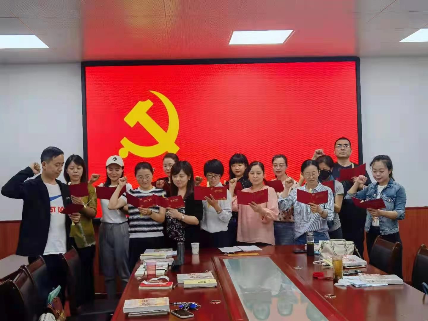 随后, 由支部委员赵斌为领誓人,带领支部党员站在党旗下郑重宣誓,重温入党誓词。此刻,高洪的声音、庄严的誓词不仅回荡在整个会场,也回荡在每一位党员的心里。宣誓完毕后,各位党员深受感动和鼓舞,纷纷发表感言,发自肺腑、诚挚感人。从二十多年党龄的老党员到两年党龄新党员,有谈到自己入党以来心路历程变化的,有谈今后奋斗方向的。但是,所有同志一致表示会更加坚定自己的共产主义信仰,牢牢铭记党员的初心使命。