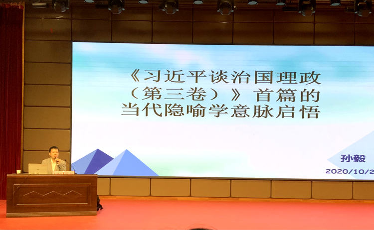 10月20日下午,Beat365中文官方网站举办了“《习近平谈治国理政》第三卷首篇的隐喻意脉启悟”专题学术讲座,广东外语外贸大学“云山杰出学者”、博士生导师孙毅教授应邀担任,梳理了当代隐喻学的发展脉络,并以《习近平谈治国理政》第三卷首篇为研究对象,探析了隐喻在政治话语中的关键作用。在问答环节,孙教授就隐喻分类、隐转喻界定等专业问题进行了耐心解答,并对论文选题、博士备考等实际问题提供了宝贵建议。