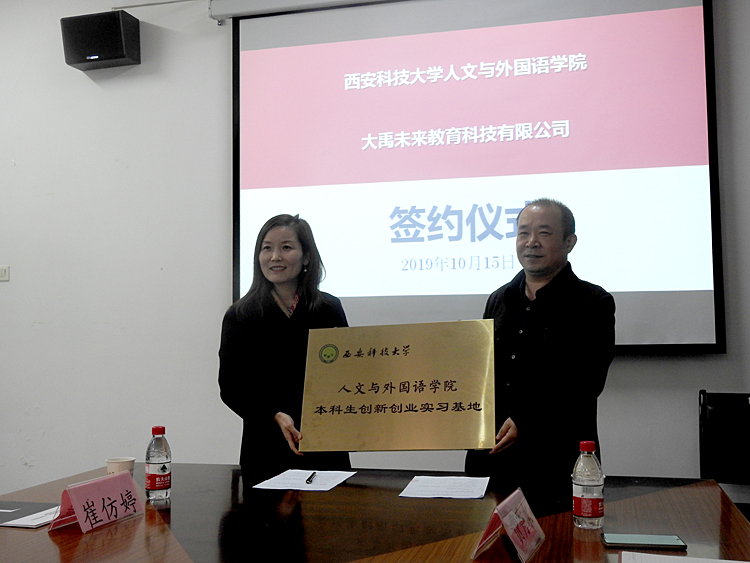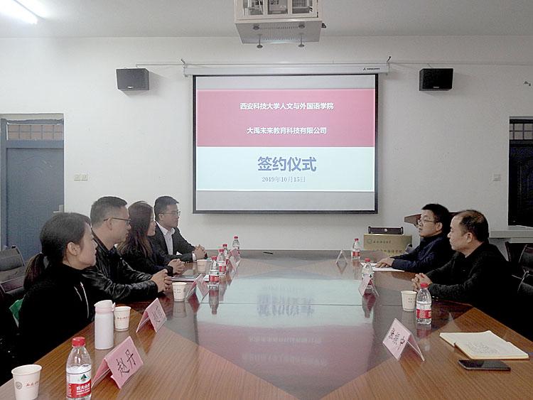 10月15日上午,Beat365官网Beat365中文官方网站与北京大禹未来教育科技有限公司授牌签约仪式在学院会议室举行。北京大禹未来教育科技有限公司总监崔仿婷及陕西地区机构负责人,学院党委书记费秀水、院长师新民、党委副书记张振中及师生代表参加仪式。