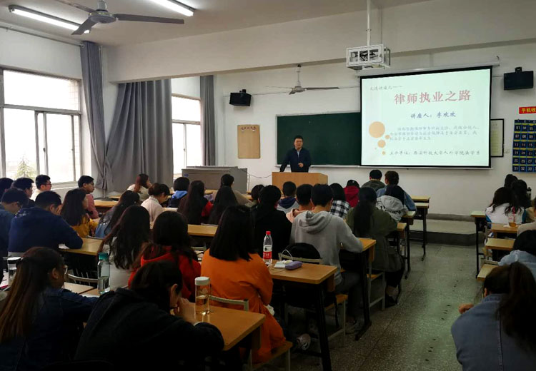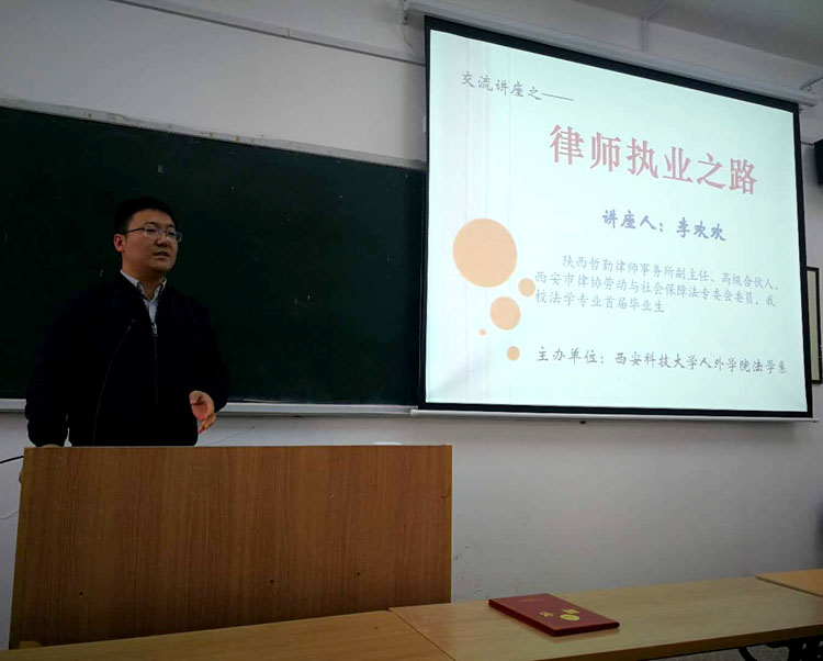 4月2日下午,Beat365中文官方网站在临潼校区2教411教室举办了职场生涯规划专题讲座。陕西哲勤律师事务所副主任、高级合伙人、西安市市律协劳动与社会保障法专委会委员、Beat365官网法学专业首届毕业生李欢欢律师应邀以《律师执业之路》为题,介绍了自己的工作和生活经历,结合具体、典型案例,总结了成败得失,分享了经验感悟,针对法学专业学生现状提出了“早觉醒”、“慎选择”、“勤努力”的建议和期盼,并在互动环节回答了师生提出的问题,对学生了解律师行业状况、科学规划个人职业生涯具有积极的借鉴和参考意义。