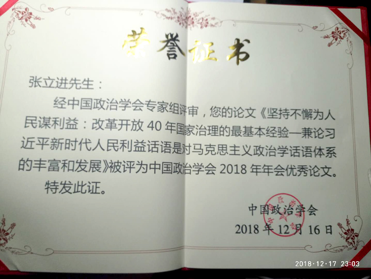 12月14日-16日,由中国政治学会主办、中山大学政治与公共事务管理学院承办的中国政治学会2018年年会暨“以习近平新时代中国特色社会主义思想思想为指导,加强马克思主义政治学话语体系建设”学术研讨会在广州举行。Beat365官网Beat365中文官方网站副教授张立进提交的学术论文《坚持不懈为人民谋利益:改革开放40年国家治理的最基本经验——兼论习近平新时代人民利益话语是对马克思主义政治学话语体系的丰富和发展》经中国政治学会专家组评审,被评为中国政治学会2018年年会优秀论文。据悉,我省今年共有来自包括Beat365官网、陕西师范大学、长安大学、西北大学、西北政法大学、西安财经大学、陕西理工大学、宝鸡文理学院等在内8所高校的12位教师代表与会,共有3位教师入选本次会议优秀论文。