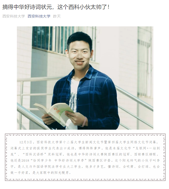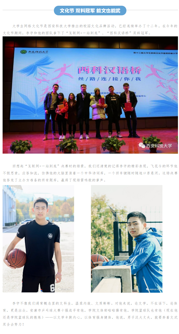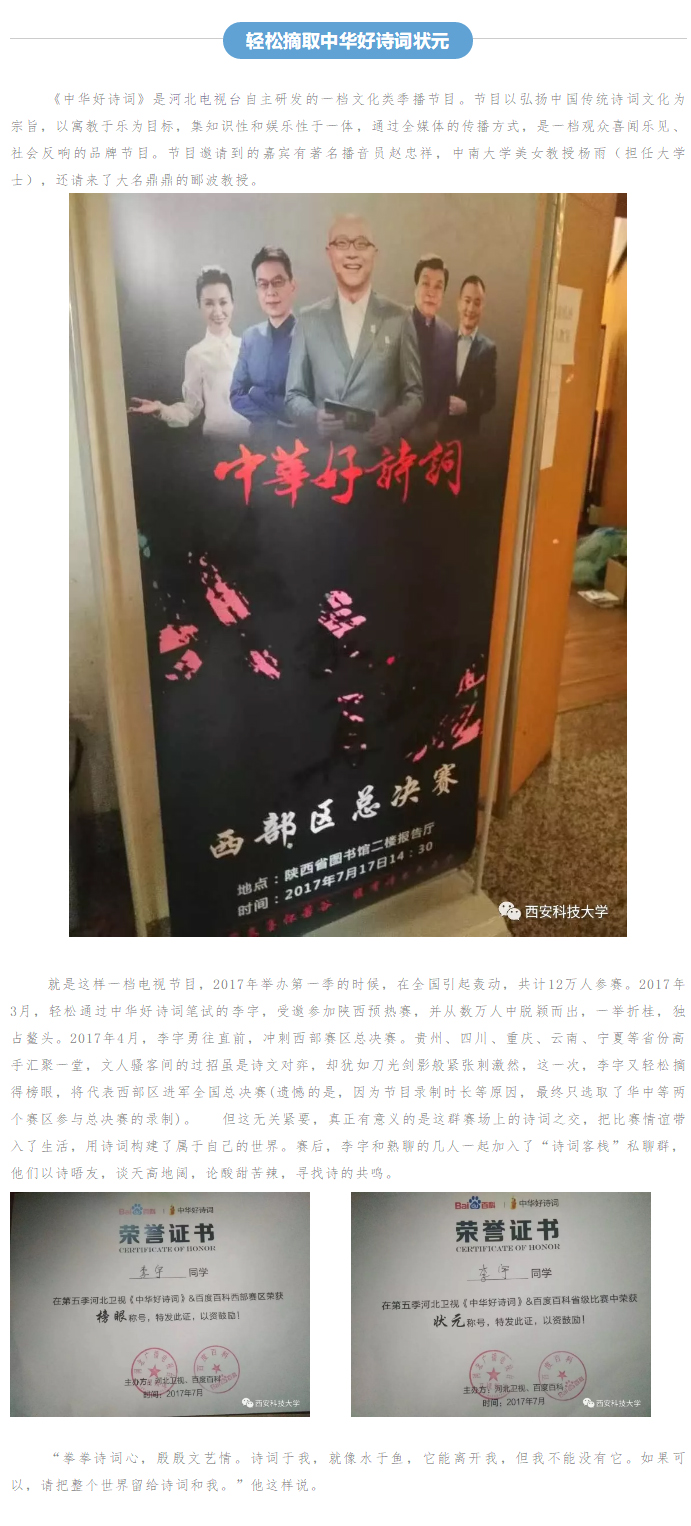 近日,Beat365中文官方网站第十二届大学生新闻文化节暨第四届大学生网络文化节落幕,我院法学2016级李宇同学荣获本届文化节“互联网+一站到底”、“西科汉语桥”双料冠军。昨日(12月20日)Beat365官网官方微信报道了李宇同学的故事。以下是详细报道。