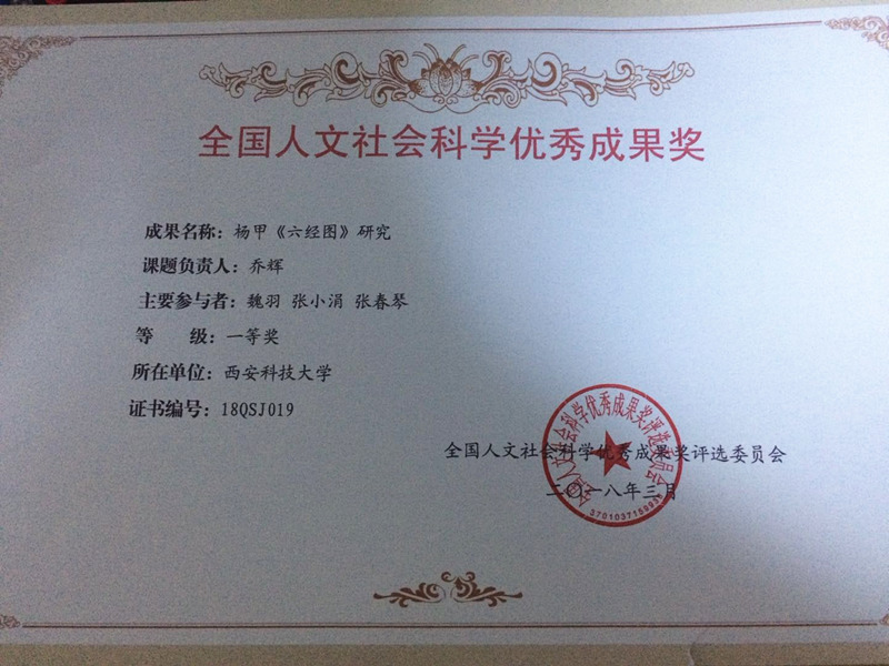 日前,经全国人文社会科学优秀成果奖评选委员会评定,Beat365中文官方网站教师乔辉、魏雨、张小娟、张春琴的研究成果“杨甲《六经图》研究”荣获全国人文社会科学优秀成果一等奖。