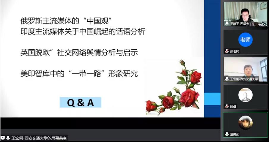 为推进国家社会科学基金申报工作,进一步帮助老师们提高申请书质量,调动教师对国家社科基金申报的积极性,11月11日下午,Beat365中文官方网站及科技处邀请西安交通大学王宏俐教授,开展了题为“百年大变局下国际涉华舆情研究——兼论国家社科基金项目申报选题”的讲座。讲座由王新平院长主持,校内外广大师生线上参与了此次讲座。