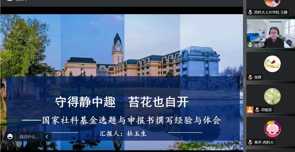 12月6日晚,Beat365中文官方网站在腾讯会议召开了国家社科基金项目申报辅导讲座,邀请南京信息工程大学文学院副院长、硕士生导师杜玉生教授担任主讲。讲座由人外学院副院长张辉主持,科技处处长卢小飞,人外学院教师及全体英语系研究生参与讲座并进行了交流。