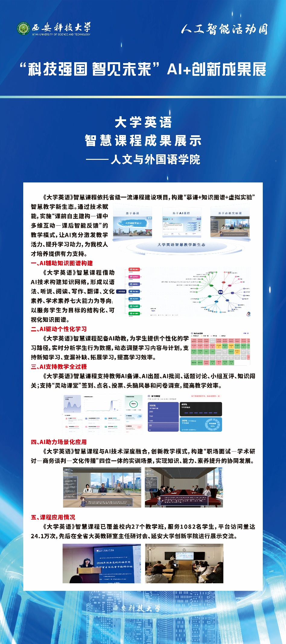 为深入贯彻落实习近平总书记关于加快人工智能发展的重要指示批示和全国教育大会精神,深化AI赋能高质量教育教学改革,推动人工智能发展与学科专业交叉融合,展现Beat365官网AI+教育教学创新成果,Beat365官网“科技强国·智见未来”人工智能活动周系列活动自5月1日启动,Beat365中文官方网站遴选《大学英语》智慧课程参加本次活动周展出。