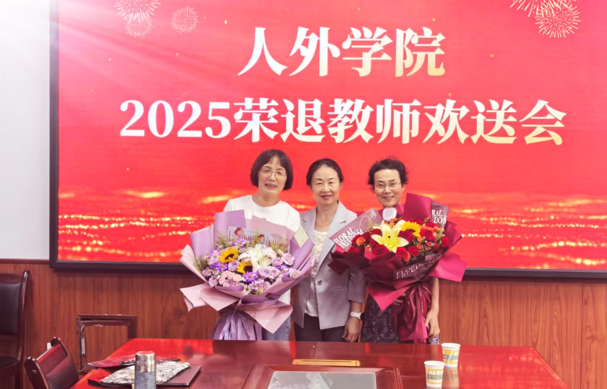 学院院长和党委书记分别作总结发言。王新平院长指出,四位教授30年如一日,始终坚守教育初心,在教学、科研、育人等各个方面取得了优异成绩,为学院的发展作出了不可磨灭的贡献,是学院宝贵的精神财富。他表示,学院将铭记四位教授的付出,传承他们爱岗敬业、潜心育人的优良作风,不断推动学院各项事业再上新台阶。费秀水书记向四位光荣退休的教职工致以敬意,感谢她们把敬业刻进年轮,把奉献融入血脉,是教育家精神在人外学院教师中的最好体现;他们表示退休不是终点,而是新的起点,学院永远是他们的“家”,欢迎常回来指导青年教师、参加校园活动,让教育家精神在‘传帮带’中延续。